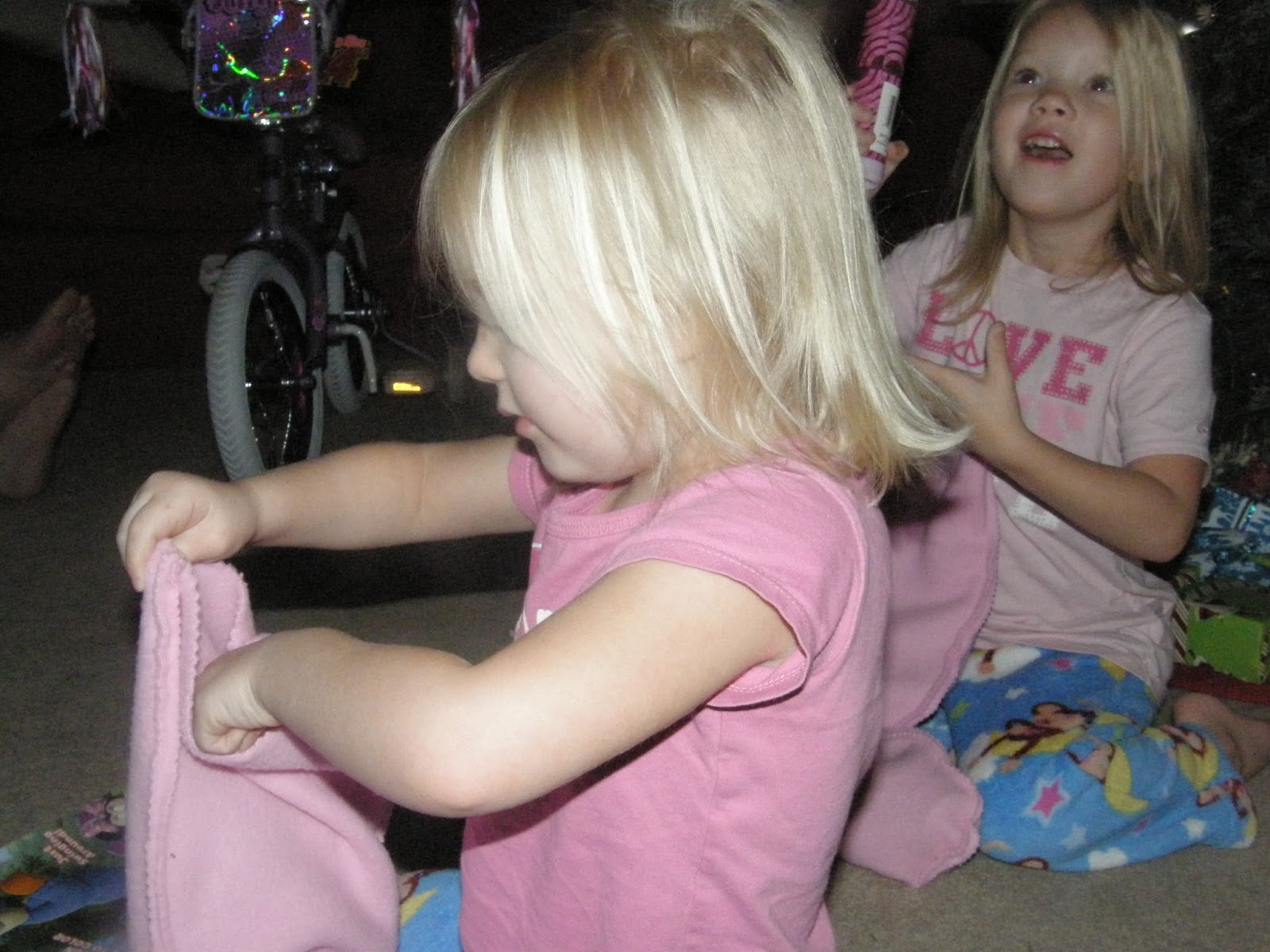 The girls new bikes that Santa brought them. I wish I could figure out why my video wont upload. Katie's first reaction was. "Mom, Santa didn't get these. . . you got them from the store! We sawl (yes, no typo that is how she pronounces saw) them and you got them for us!" Can't pull anything over on this five year old! Thought the magic would last a little longer guess not. She was still happy to receive it though, now if we could just get her to ride without her training wheels!